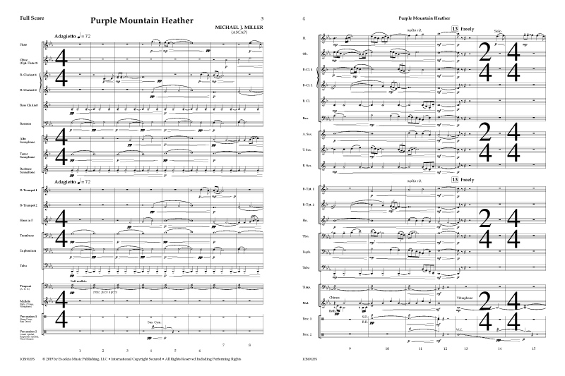 In the late summer months, the Scottish countryside is covered by the heather flower. Purple in color, it makes the otherwise harsh landscape a place of tranquil beauty. In this adaptation of the Scottish folk song Wild Mountain Thyme, composer Michael J. Miller’s Purple Mountain Heather captures the serenity of the Scottish moors in full bloom. Flowing melodies phrased with expressive shaping are passed throughout the ensemble, creating heartfelt drama for all to enjoy!